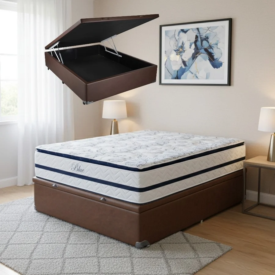 Colchão Casal Blue D33 + Base Box Baú Corino Marrom – PAROPAS + ALTO NÍVEL CAMAS E COLCHÕES