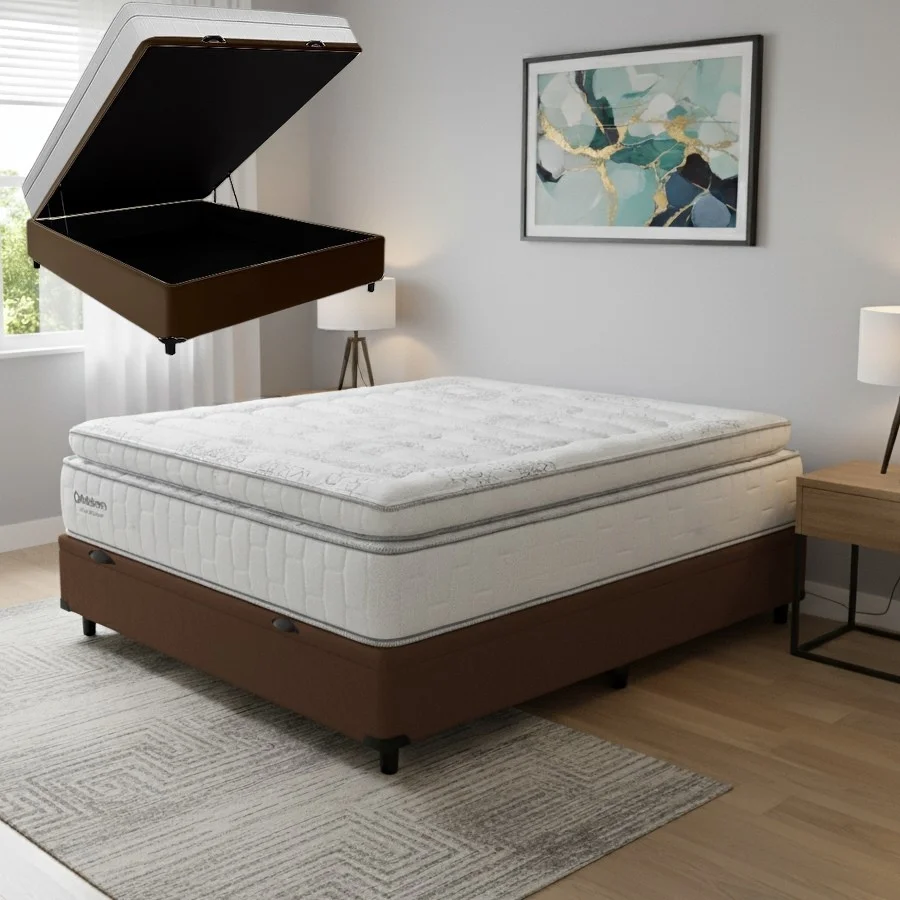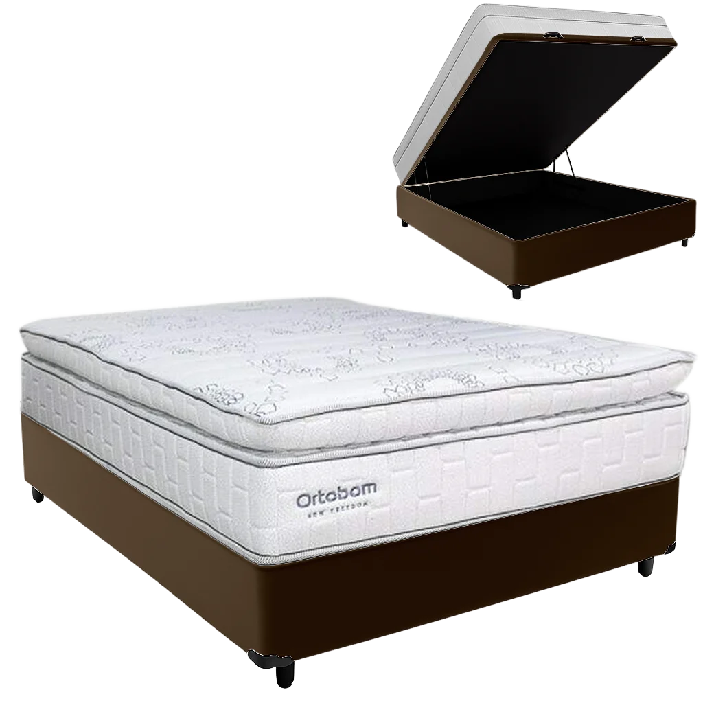 Colchão Casal New Freedom D33 + Base Box Baú Corino Marrom – ORTOBOM + BIOSTAR