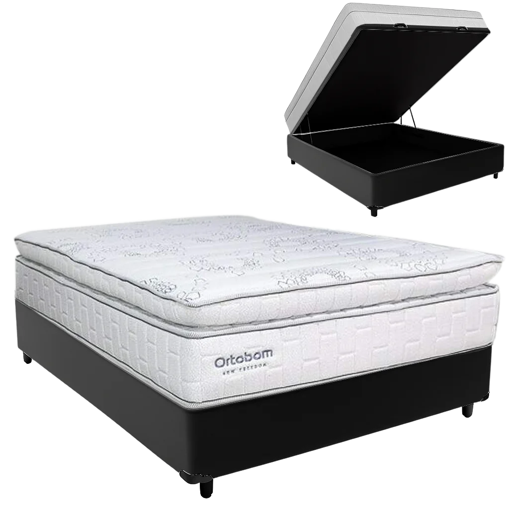 Colchão Casal New Freedom D33 + Base Box Baú Corino Preto – ORTOBOM + BIOSTAR