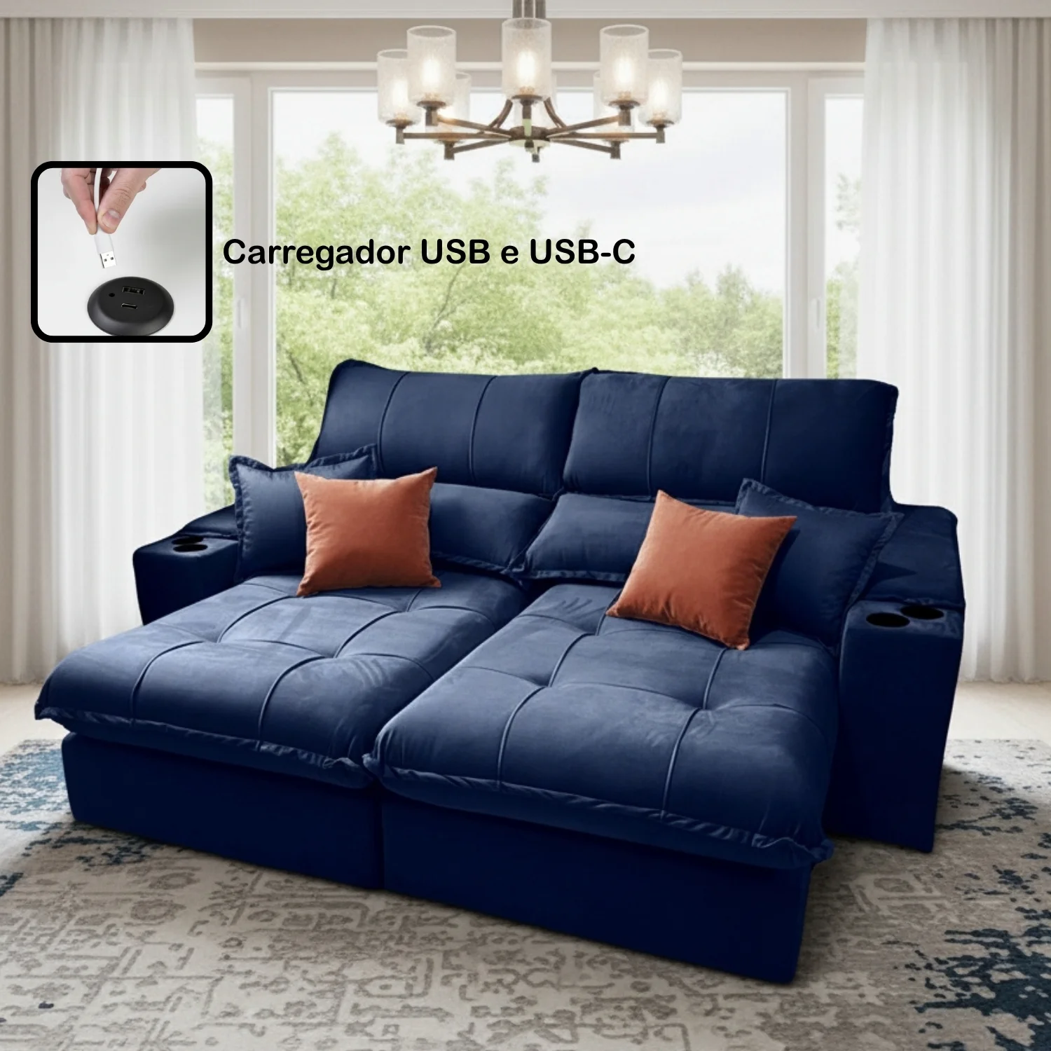Sofá Retrátil e Reclinável Afrodite Slim 2,50 m Veludo Azul 104 – ZARAT ESTOFADOS