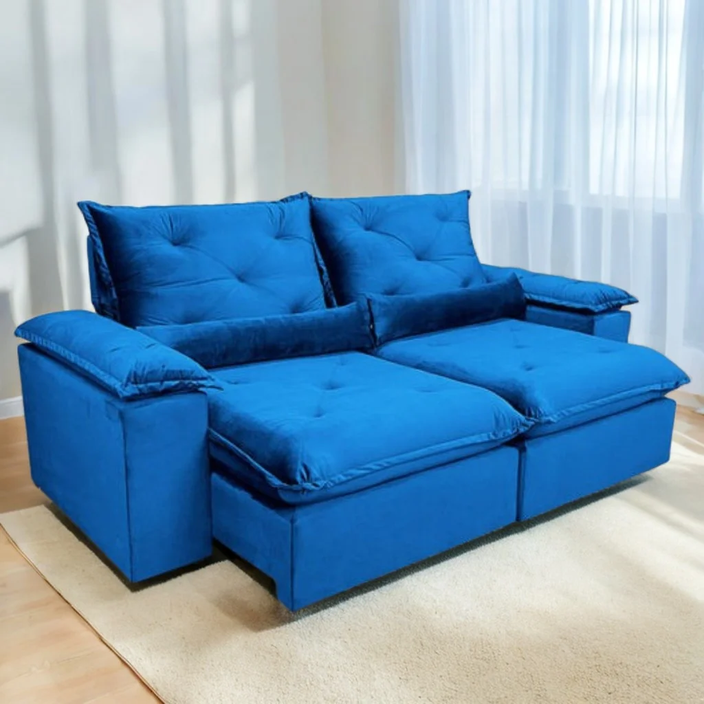 Sofá Retrátil e Reclinável Brasão 2,00 m Veludo Azul – MD ESTOFADOS