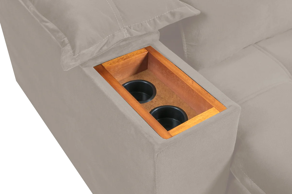 – Bandeja embutida retrátil com dois porta copos nos dois braços